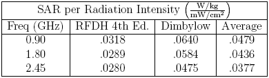 The table to the left summarizes the results of Dimbylow and the RFDH (the average of the two results will be used for all calculations). Values for the SAR can be found by multiplying the appropriate entry by the incident radiation intensity (e.g. for 5 mW/cm sq at 1.80 GHz, the SAR is 5*.0436 = 0.218 W/kg). In the frequency range of interest (.85 GHz to 2.45 GHz), the SAR decreases as the frequency increases (for equal intensities, more .85 GHz radiation is absorbed than 2.45 GHz).